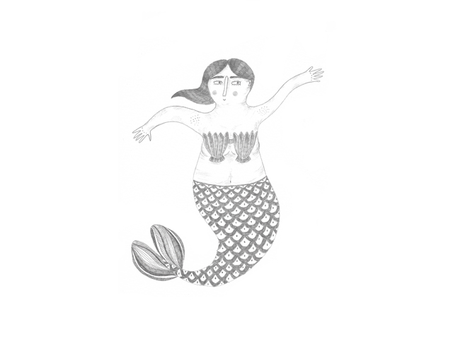 • Desenho a cinzento de uma sereia com conchas no peito e cauda com escamas.