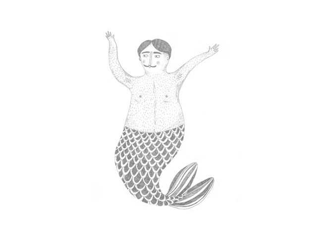 • Desenho a preto e branco de um tritão com cauda de peixe e corpo humano nu.