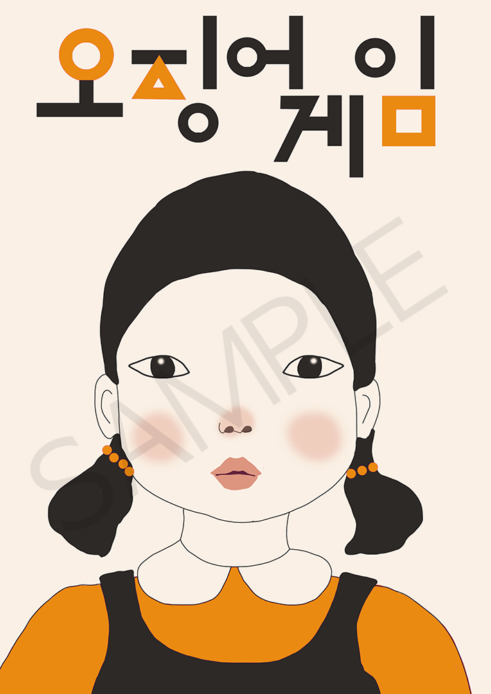 • Desenho de uma rapariga de cabelo preto com roupa laranja e preta e texto em coreano a preto e laranja num fundo bege.