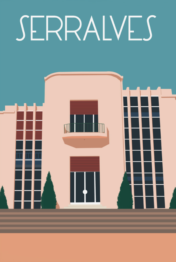 • Ilustração de edifício cor-de-rosa com janelas e persianas castanhas e texto SERRALVES.