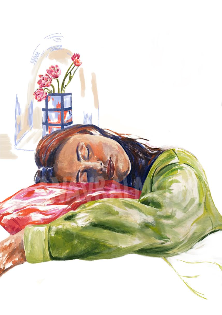 • Mulher a dormir com camisola verde e almofada vermelha, vaso azul com flores cor-de-rosa no fundo