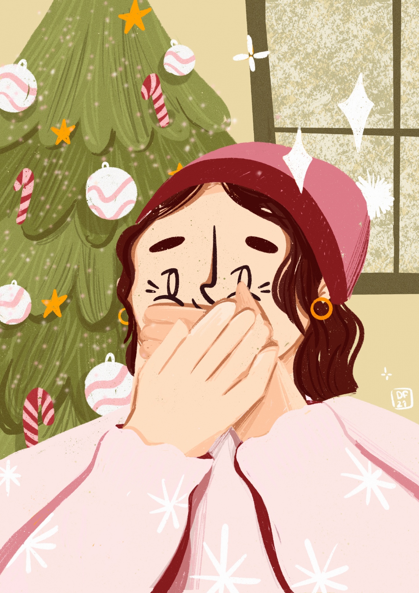 • Pessoa com roupão rosa e gorro vermelho ao lado de árvore de Natal decorada