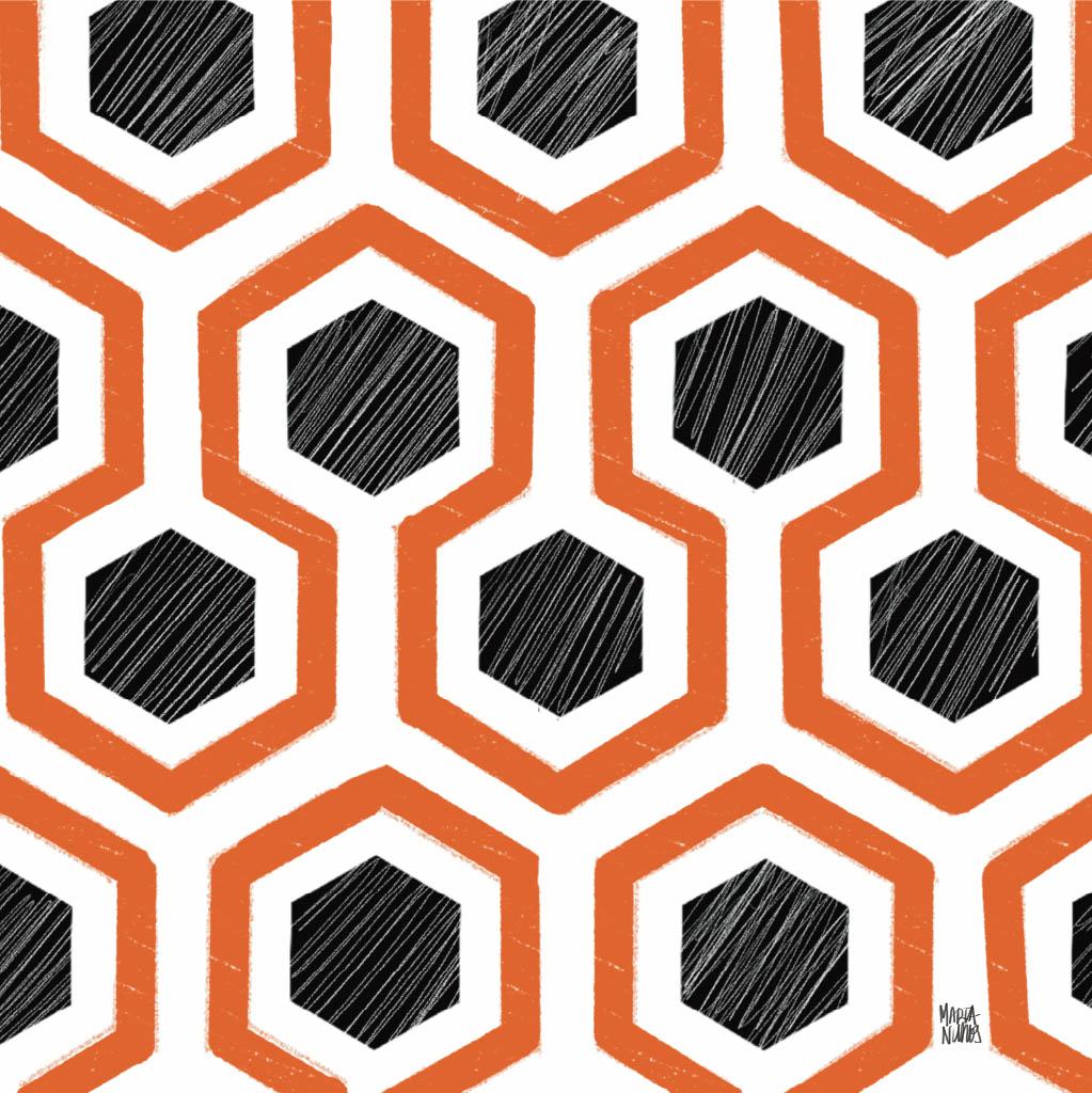 • Padrão geométrico de hexágonos preto e laranja com textura riscada