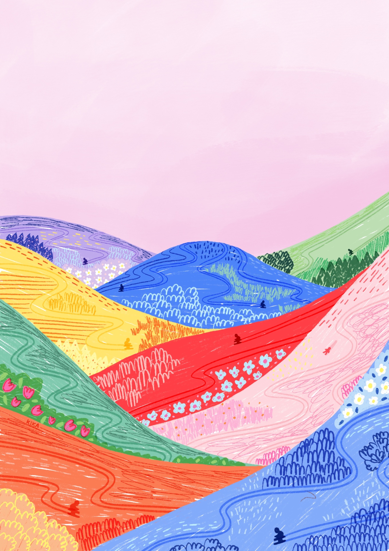 • Colinas coloridas com padrões texturizados e um céu rosa claro