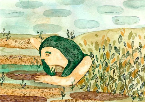 Ilustração artística de uma figura humana com cabelo verde entre plantas e raízes em estilo aquarela