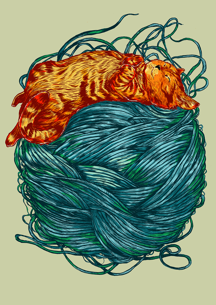 • Desenho de gato laranja a dormir em novelo de lã azul