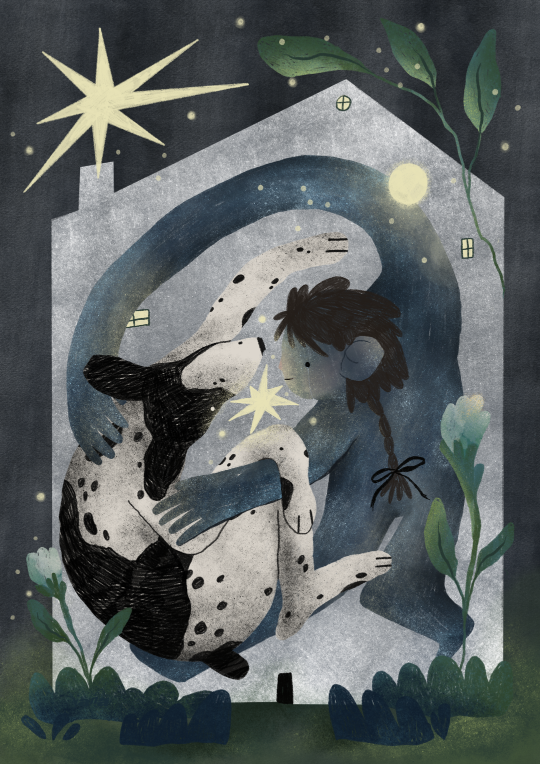 Ilustração digital de um humano e um cão abraçados, rodeados por natureza e uma estrela brilhante.