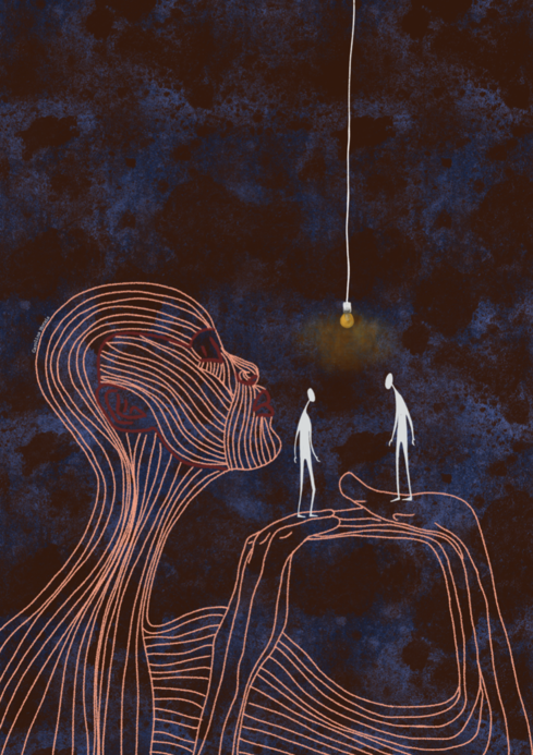 Ilustração de figura humana com linhas cor de laranja segurando duas pequenas figuras brancas iluminadas por uma lâmpada amarela