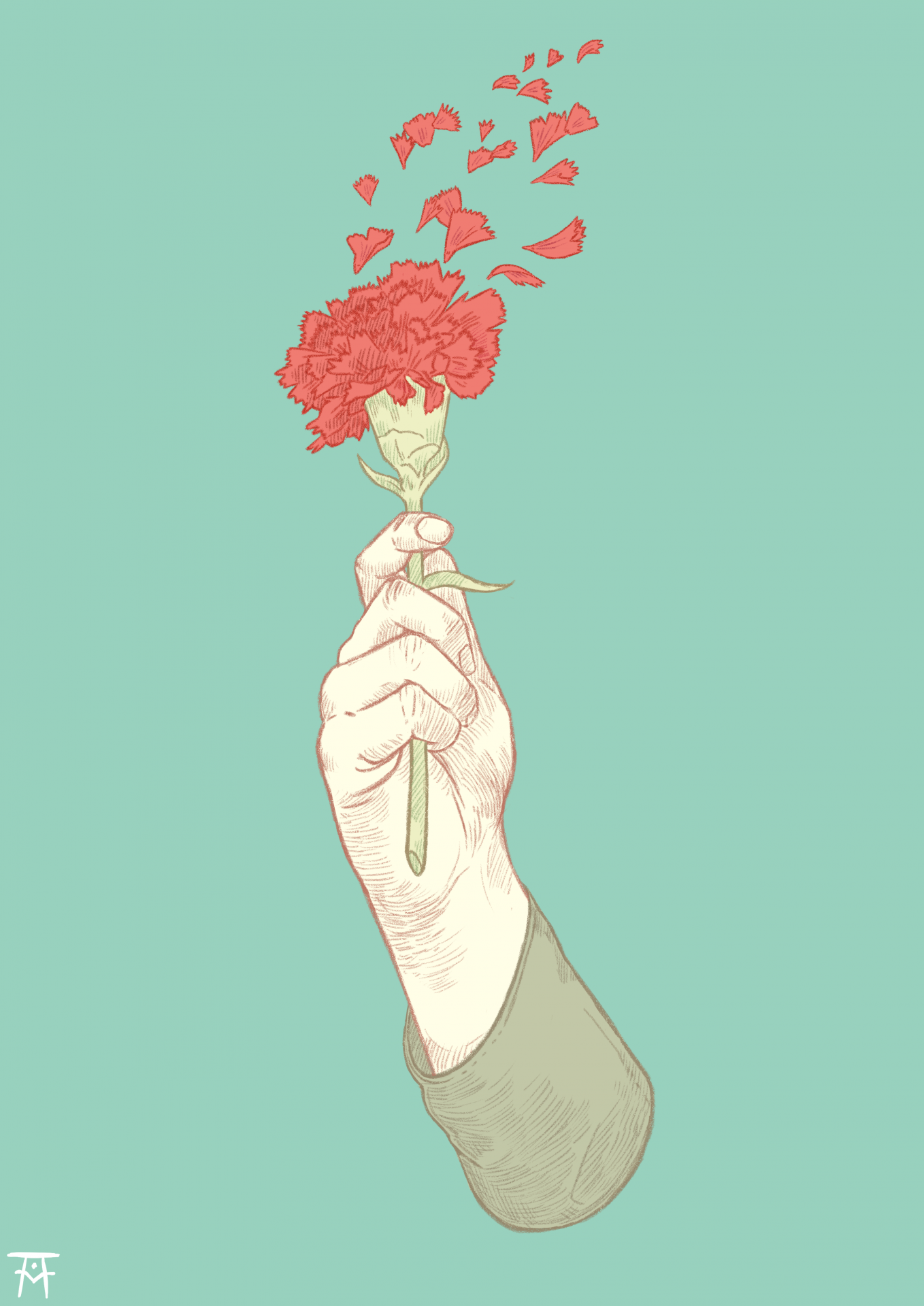 • Mão segurando cravo vermelho com pétalas a desvanecer no ar em fundo azul claro