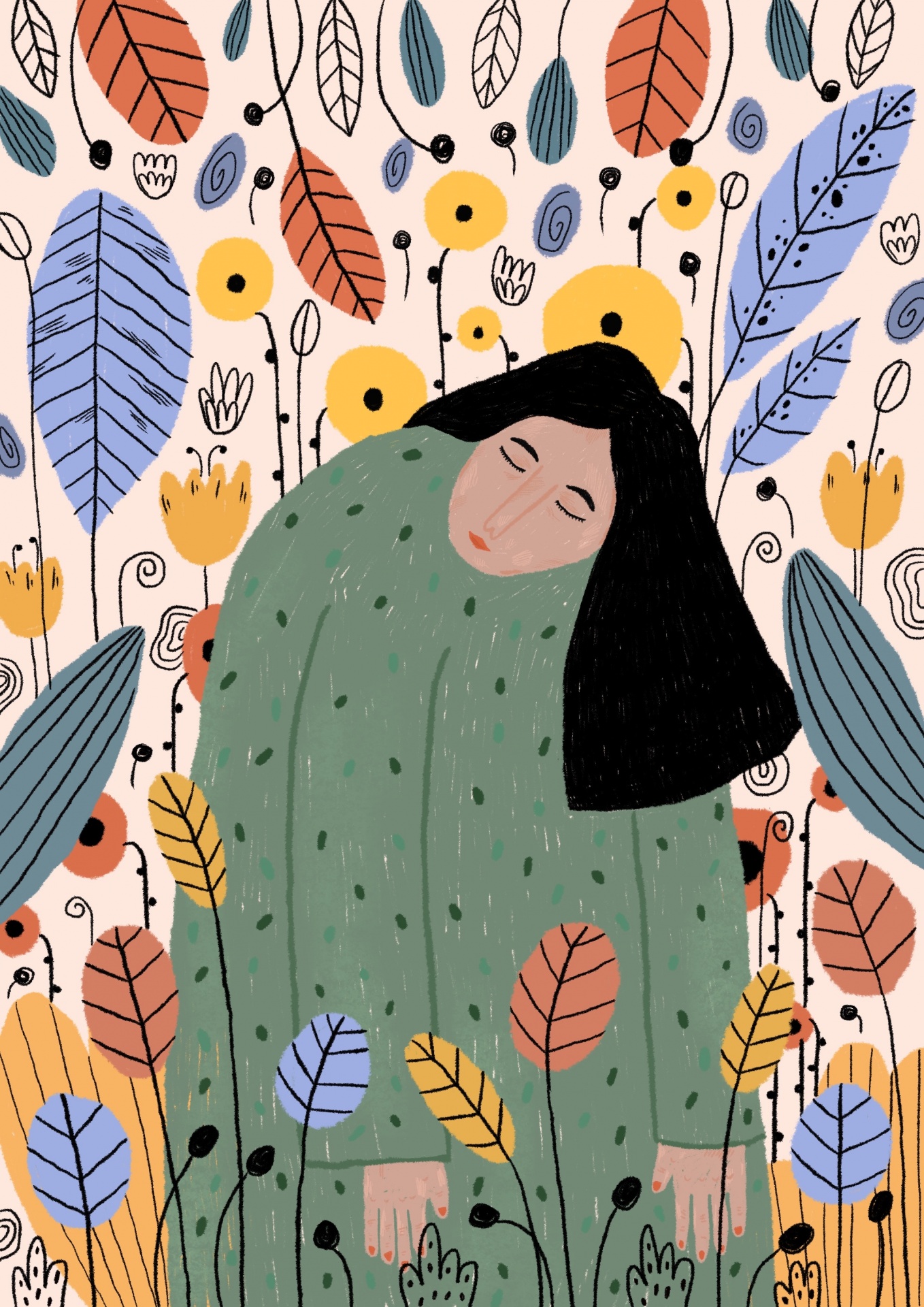 • Mulher em casaco verde rodeada de folhas e flores coloridas em estilo ilustrativo