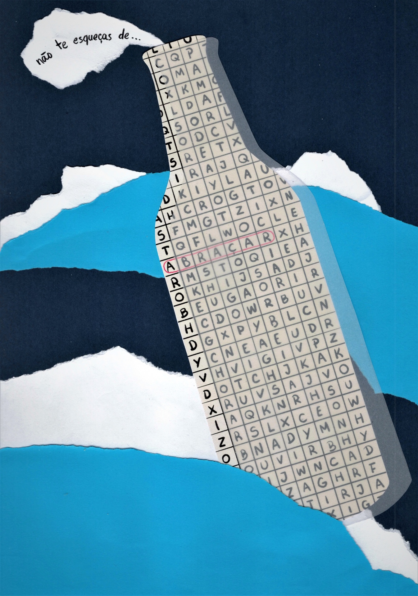 • Desenho de garrafa com grelha de letras e texto manuscrito 'não te esqueças de...' num fundo azul e branco.