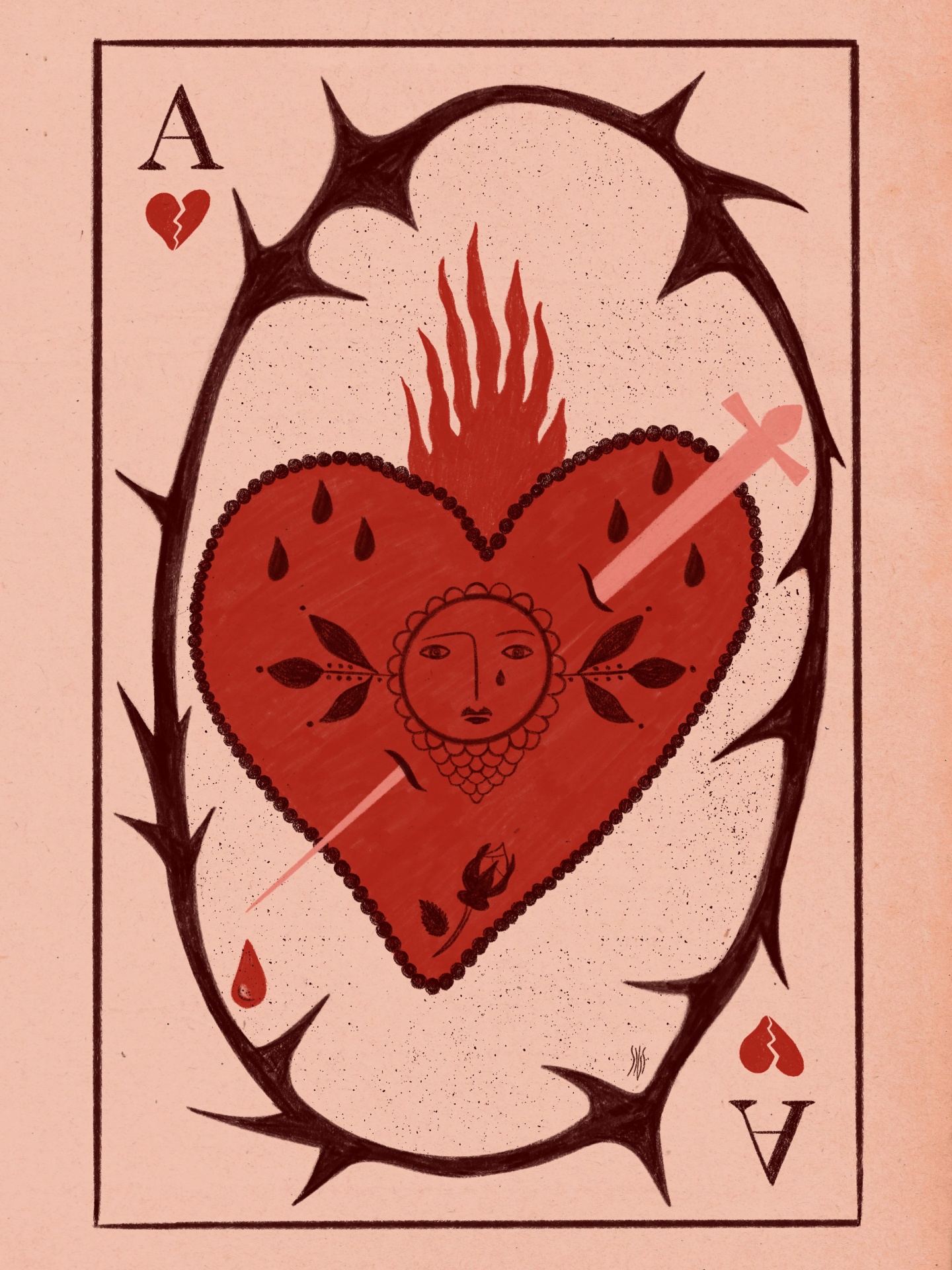 • Ilustração do Ás de Copas com coração vermelho e detalhes decorativos.
