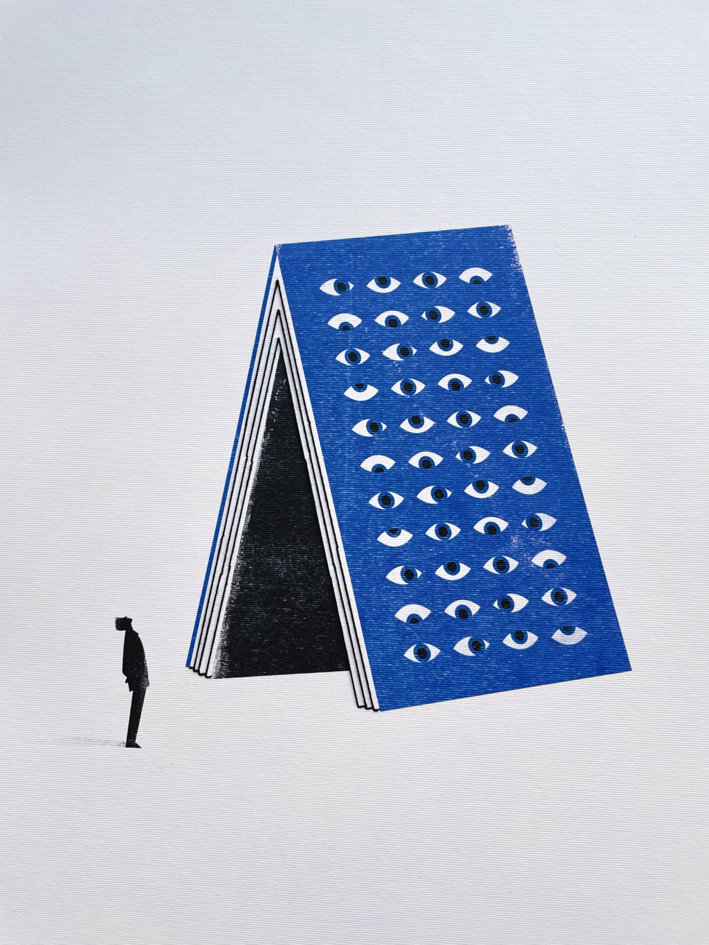 • Pessoa em silhueta junto a uma estrutura azul com desenhos de olhos