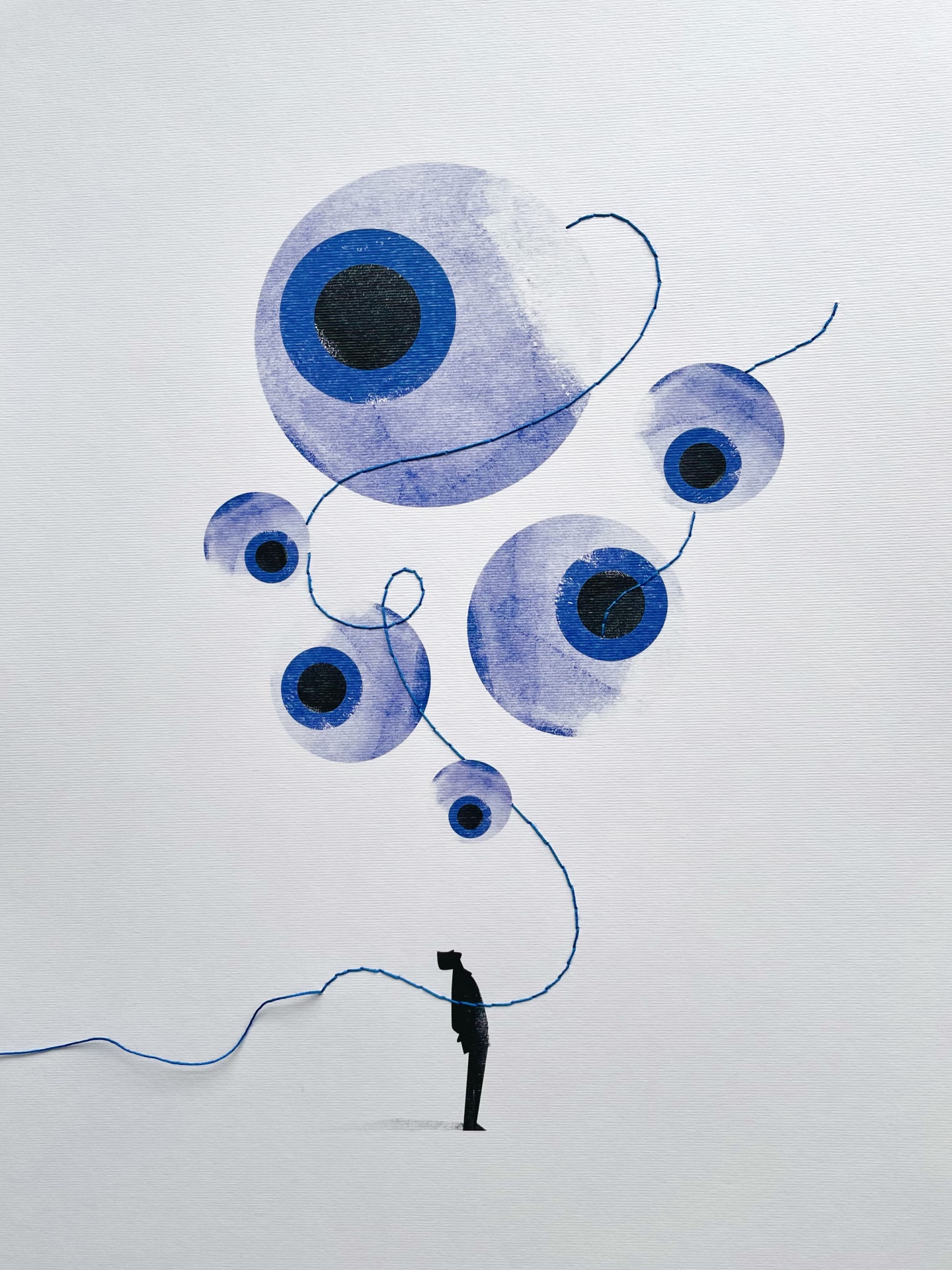 • Ilustração com figura humana segurando fio ligado a círculos azuis similiares a olhos
