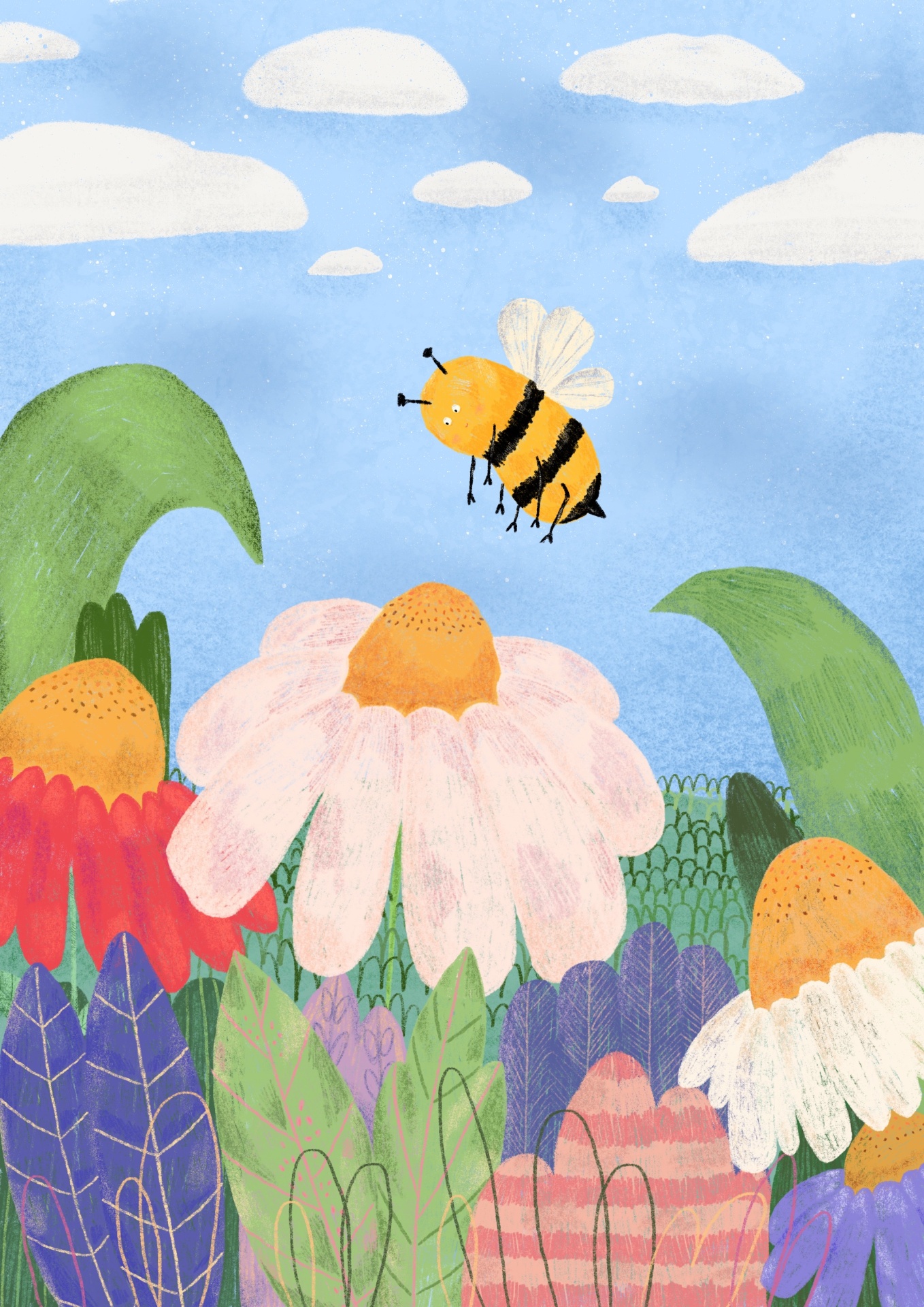 • Ilustração de uma abelha voando sobre flores coloridas sob um céu azul com nuvens.