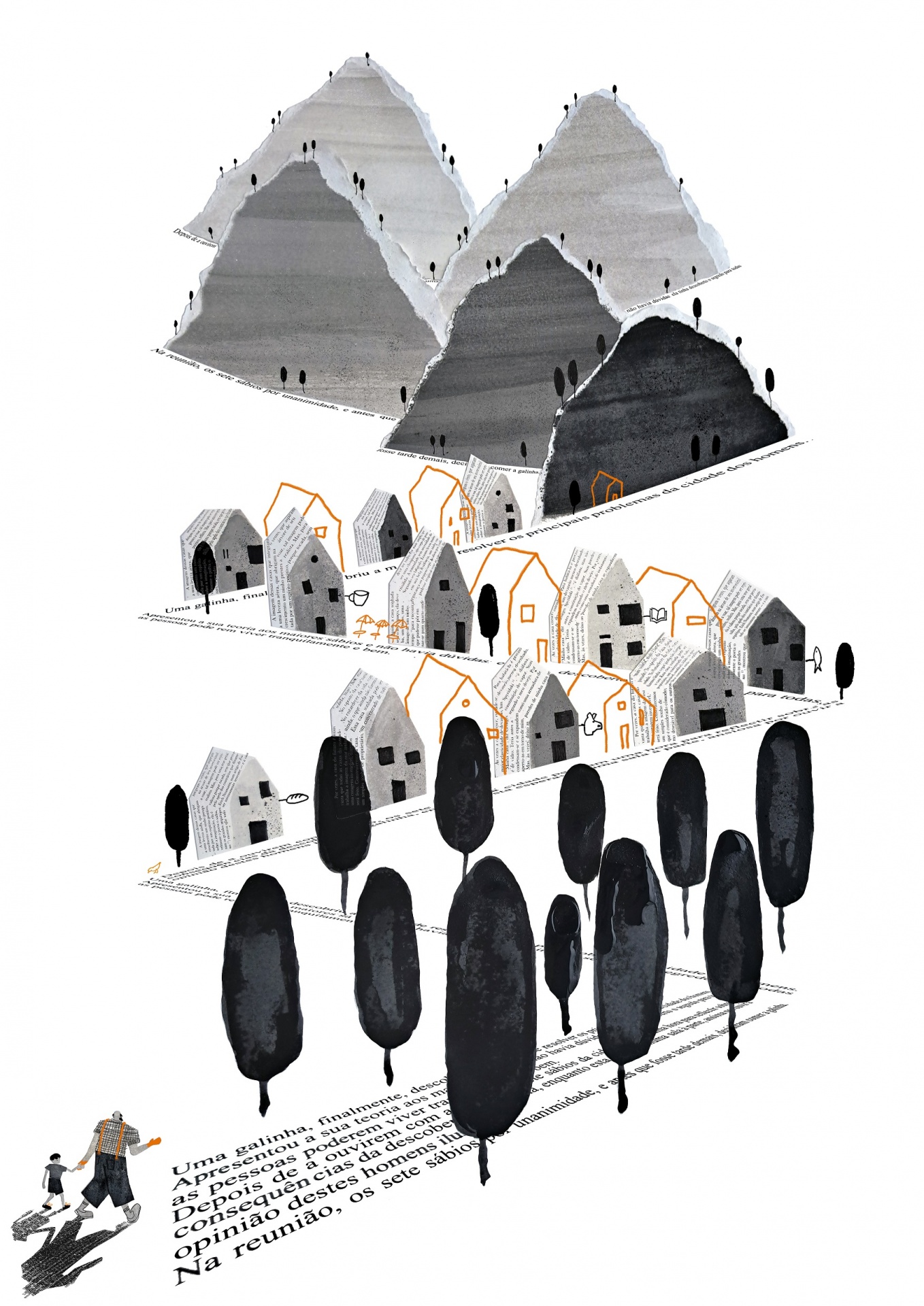 • Ilustração artística de vilarejo com casas, árvores e montanhas em tons de cinzento e preto