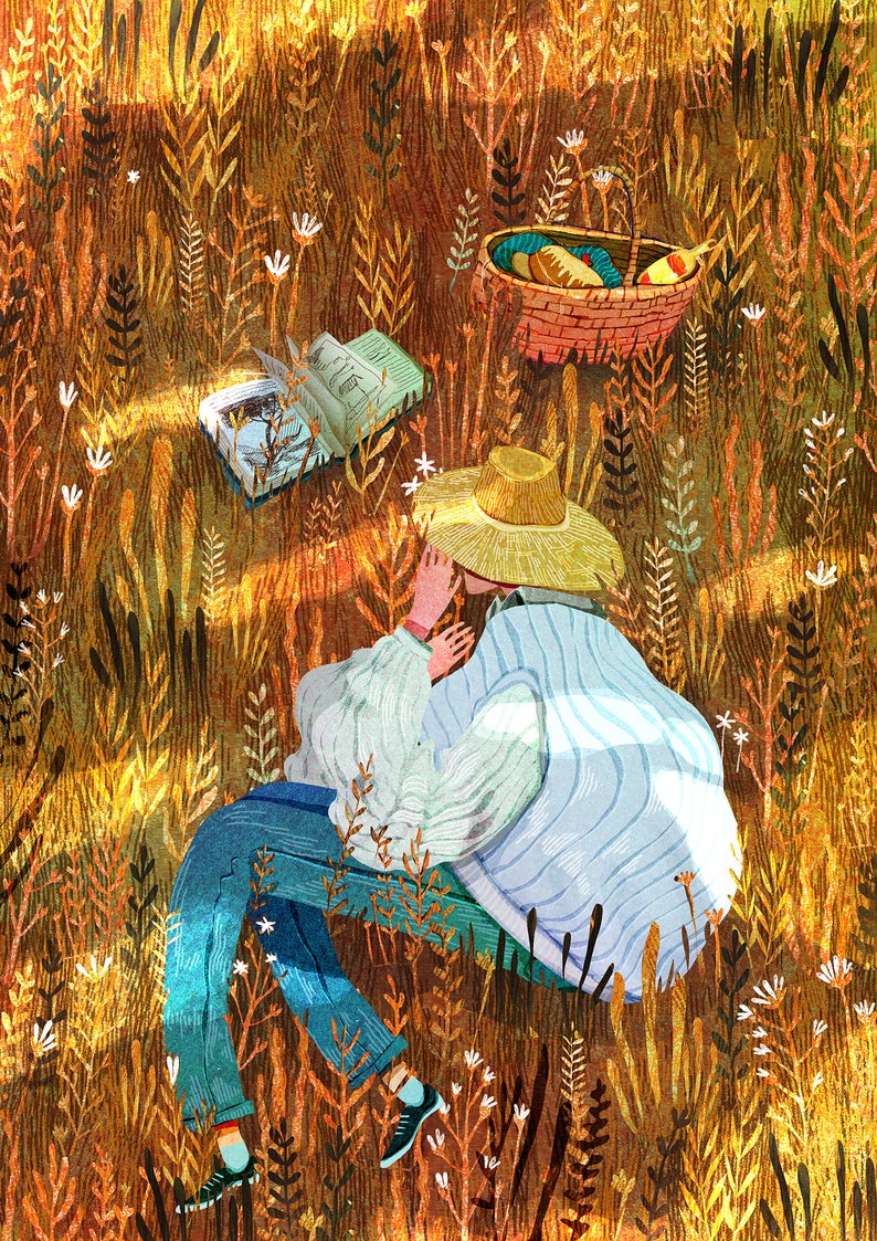 • Pessoa a ler num campo amarelo com chapéu de palha, livro aberto e cesta com frutas
