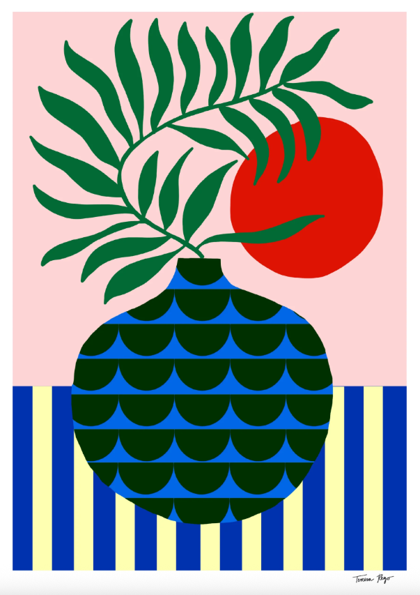 • Ilustração de vaso azul com padrão verde, folhas verdes e círculo vermelho, fundo rosa e superfície às riscas azuis e amarelas