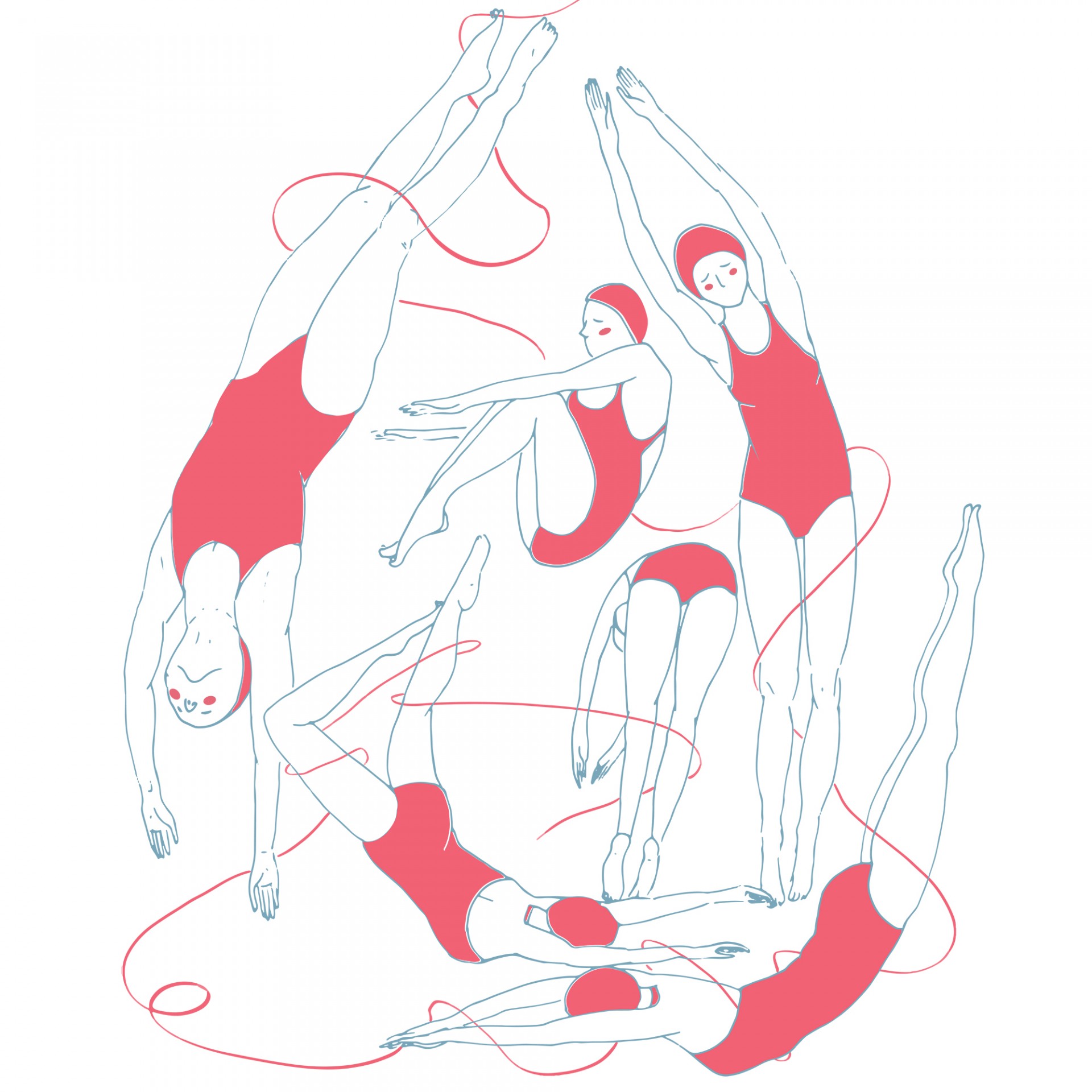 • Ilustração de mulheres em maiôs vermelhos a mergulhar e nadar sincronizadas