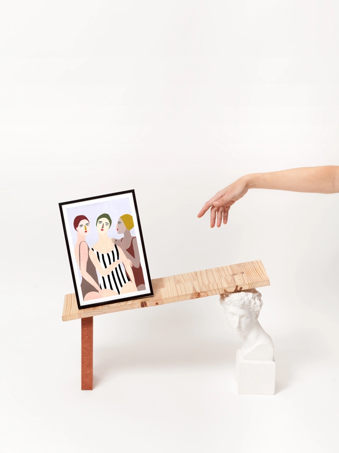 • Pintura emoldurada de três figuras femininas sobre prancha de madeira apoiada em pedestal branco e perna de madeira.