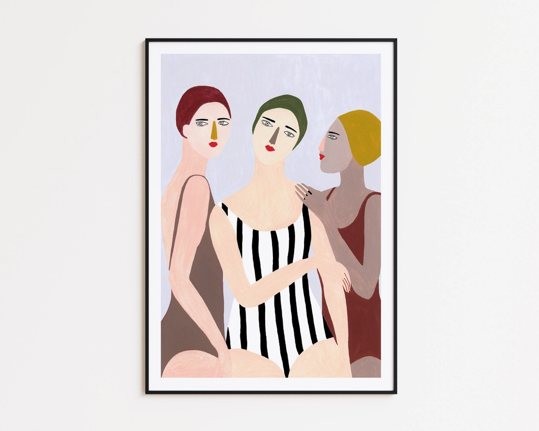 • Desenho minimalista de três mulheres de fato de banho colorido em moldura preta
