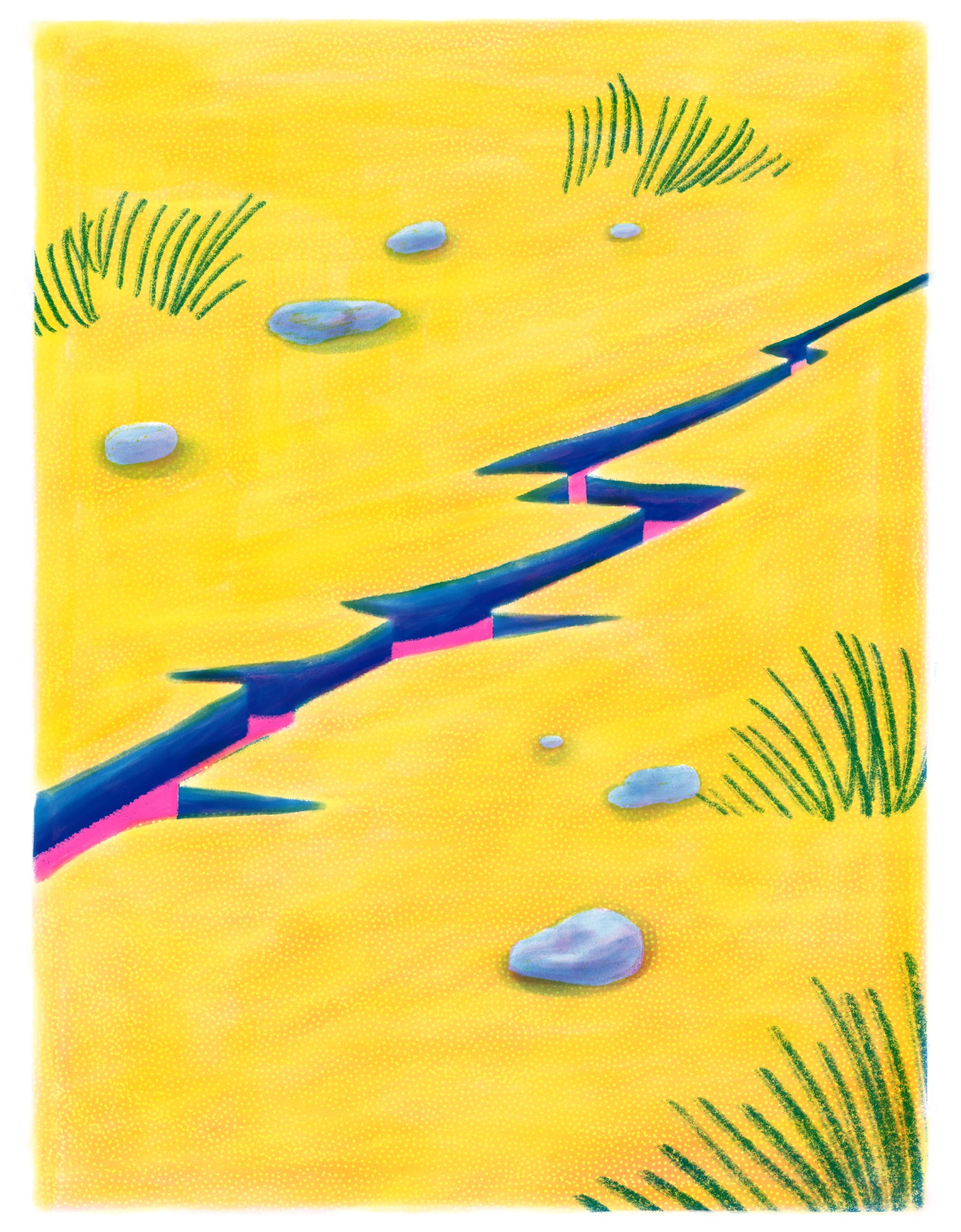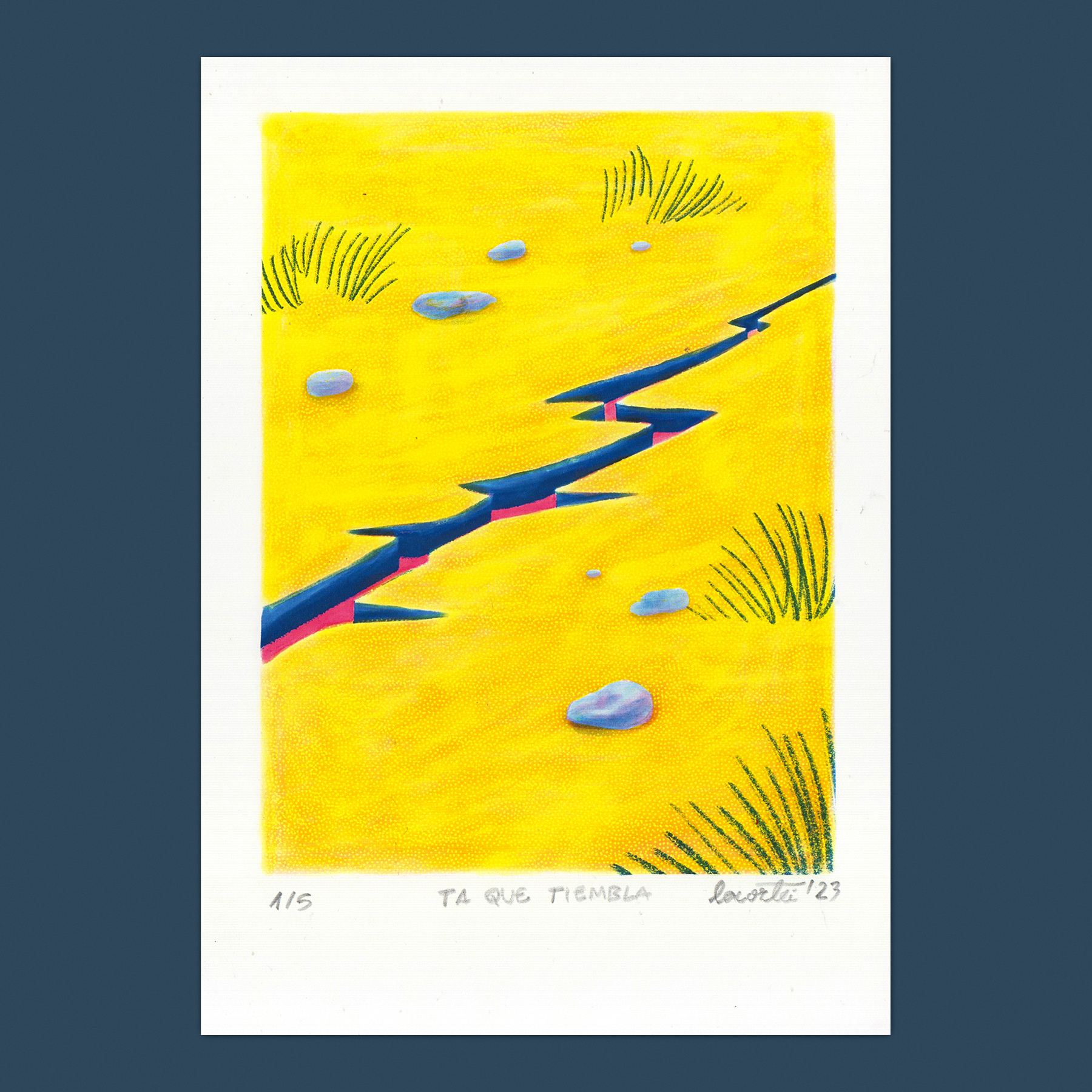 • Ilustração de fissura azul com pedras e vegetação em fundo amarelo, com texto e assinatura no rodapé