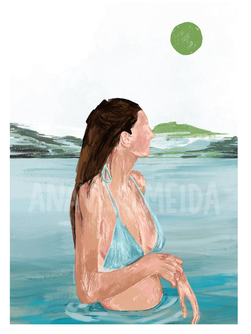 Ilustração de mulher com biquíni azul em água com paisagem de montanhas ao fundo