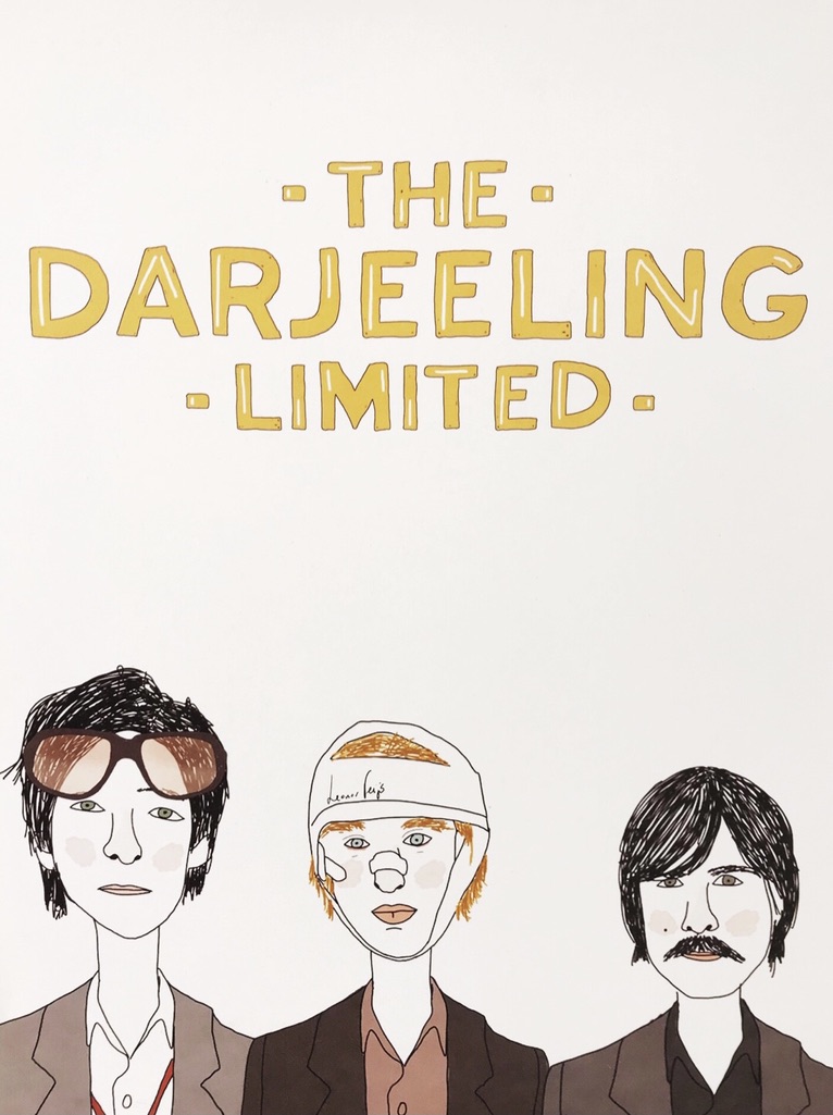 Ilustração com três homens e texto THE DARJEELING LIMITED em amarelo