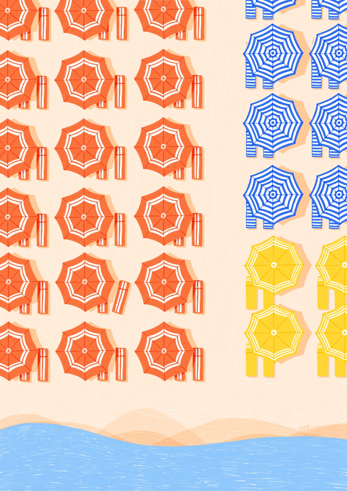 • Praia vista de cima com guarda-sóis vermelhos, azuis e amarelos organizados em filas e mar azul ao fundo