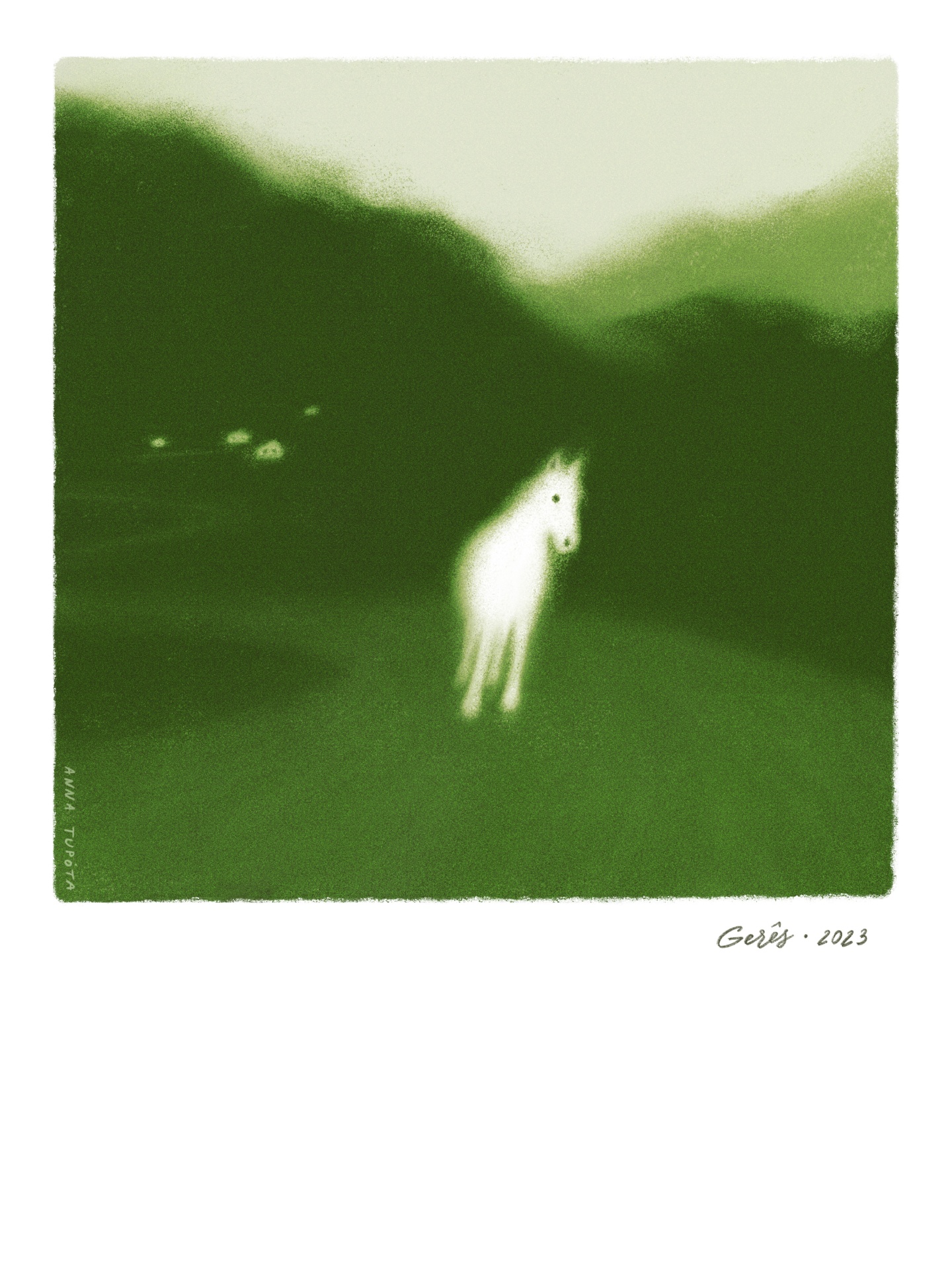 • Imagem artística de cavalo branco com fundo verde e texto Gerês 2023