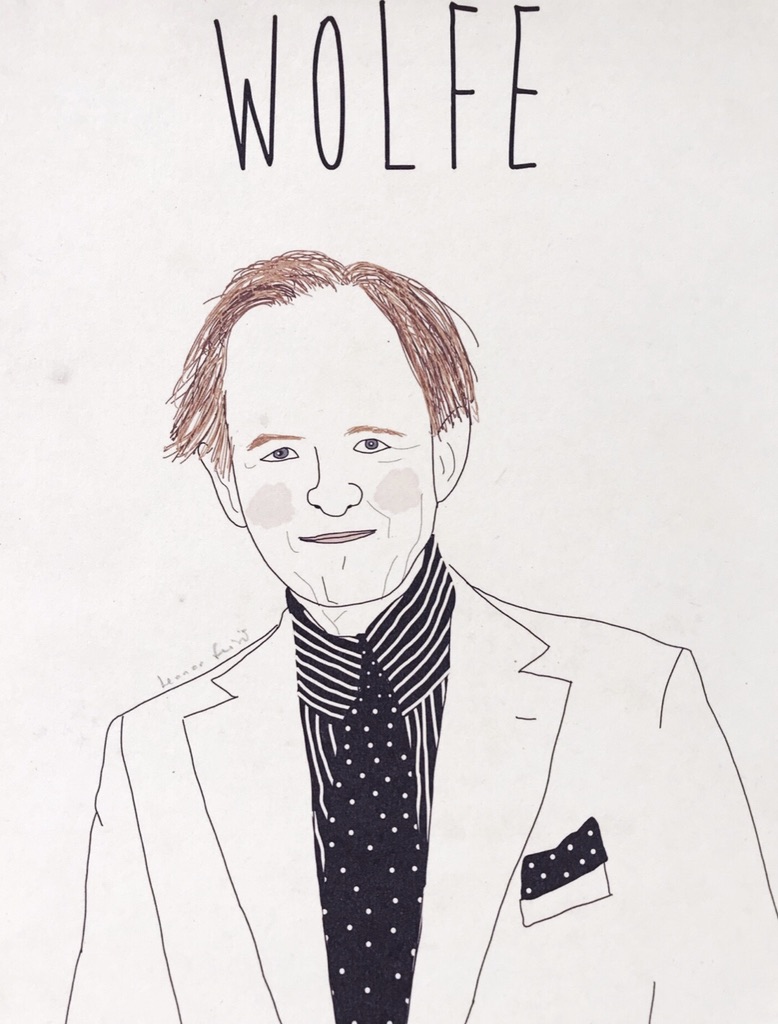• Ilustração de homem com fato branco e gravata preta com pontos brancos, com texto WOLFE acima