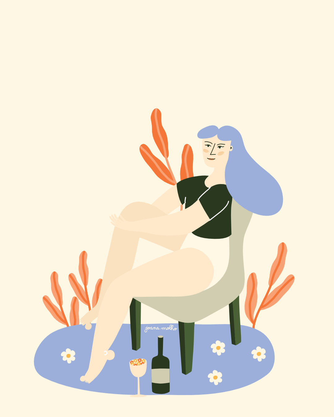 • Ilustração de mulher sentada numa cadeira rodeada por plantas, com garrafa e copo à frente