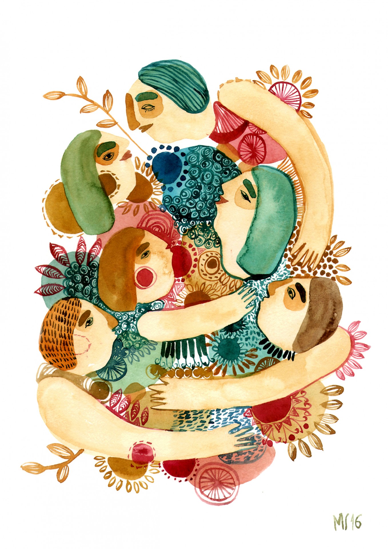 • Ilustração artística de seis pessoas abraçadas com padrões florais e vegetais coloridos