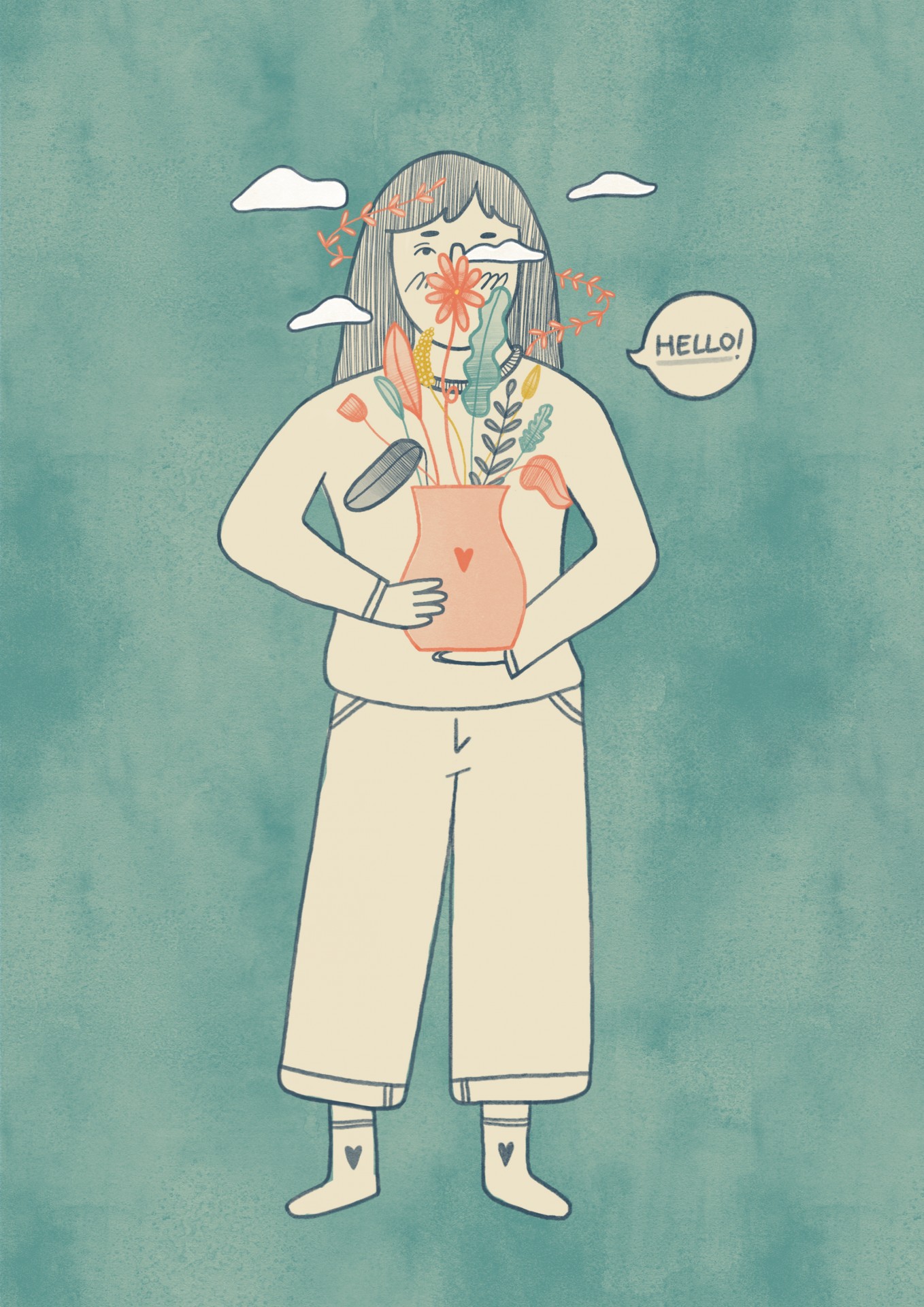 Ilustração de personagem a segurar vaso com flores e balão de fala 'HELLO!'