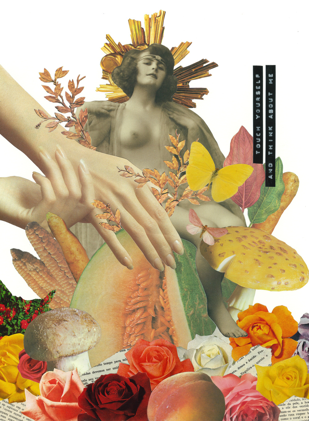 • Colagem artística com figura feminina, mãos, frutas, cogumelos, borboletas e flores