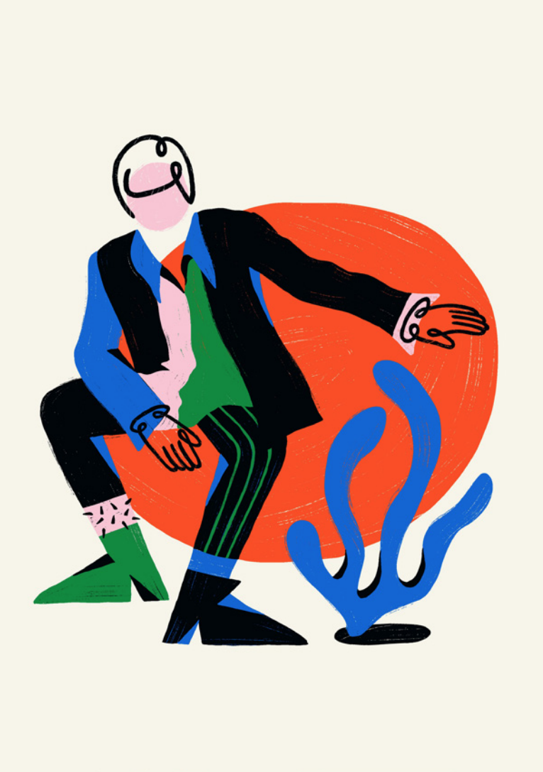 Ilustração de figura humana colorida com roupa formal em fundo abstrato laranja e azul