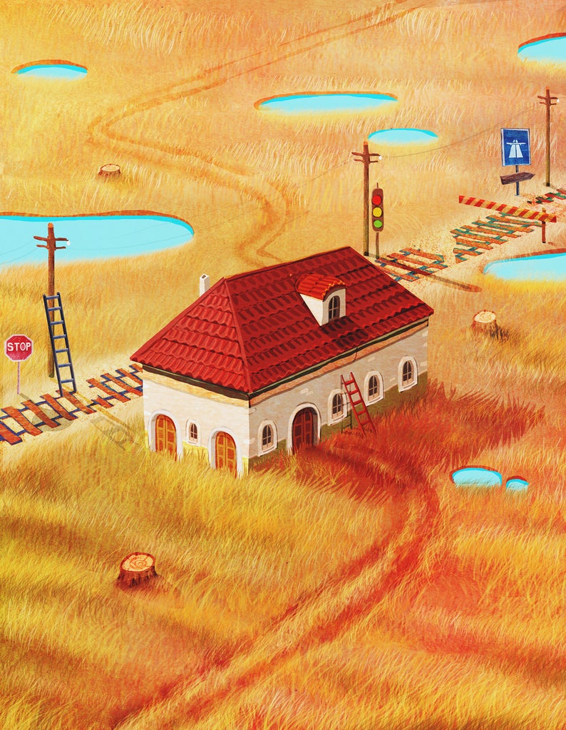 • Ilustração de casa branca com telhado vermelho num campo amarelo com sinal STOP e semáforo