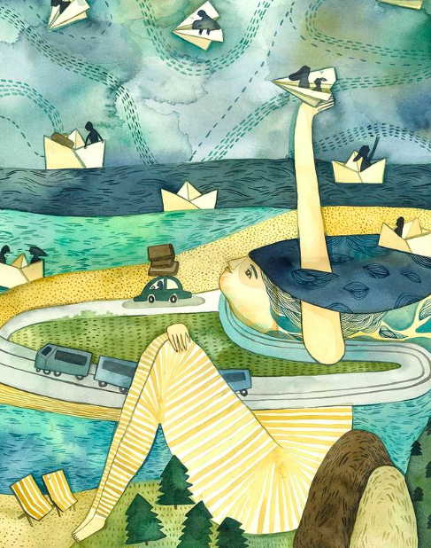 • Desenho de pessoa deitada com roupa amarela e azul, com barcos de papel e veículos ao fundo.