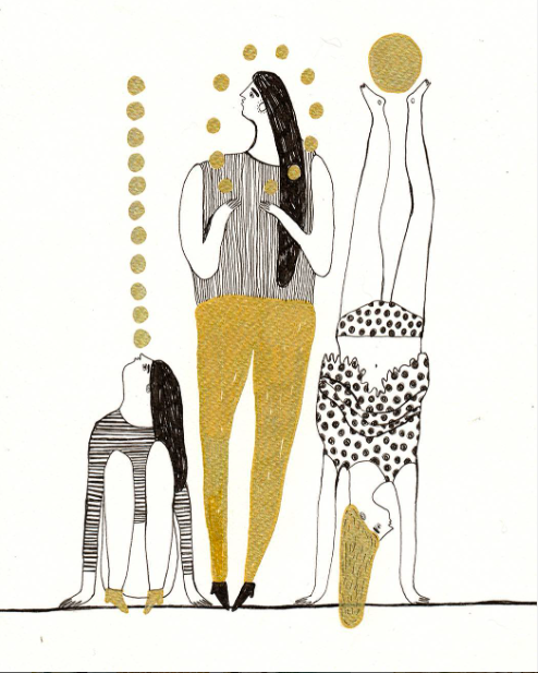 Ilustração minimalista de três mulheres com roupas pretas, brancas e douradas, em várias posturas com bolas douradas.