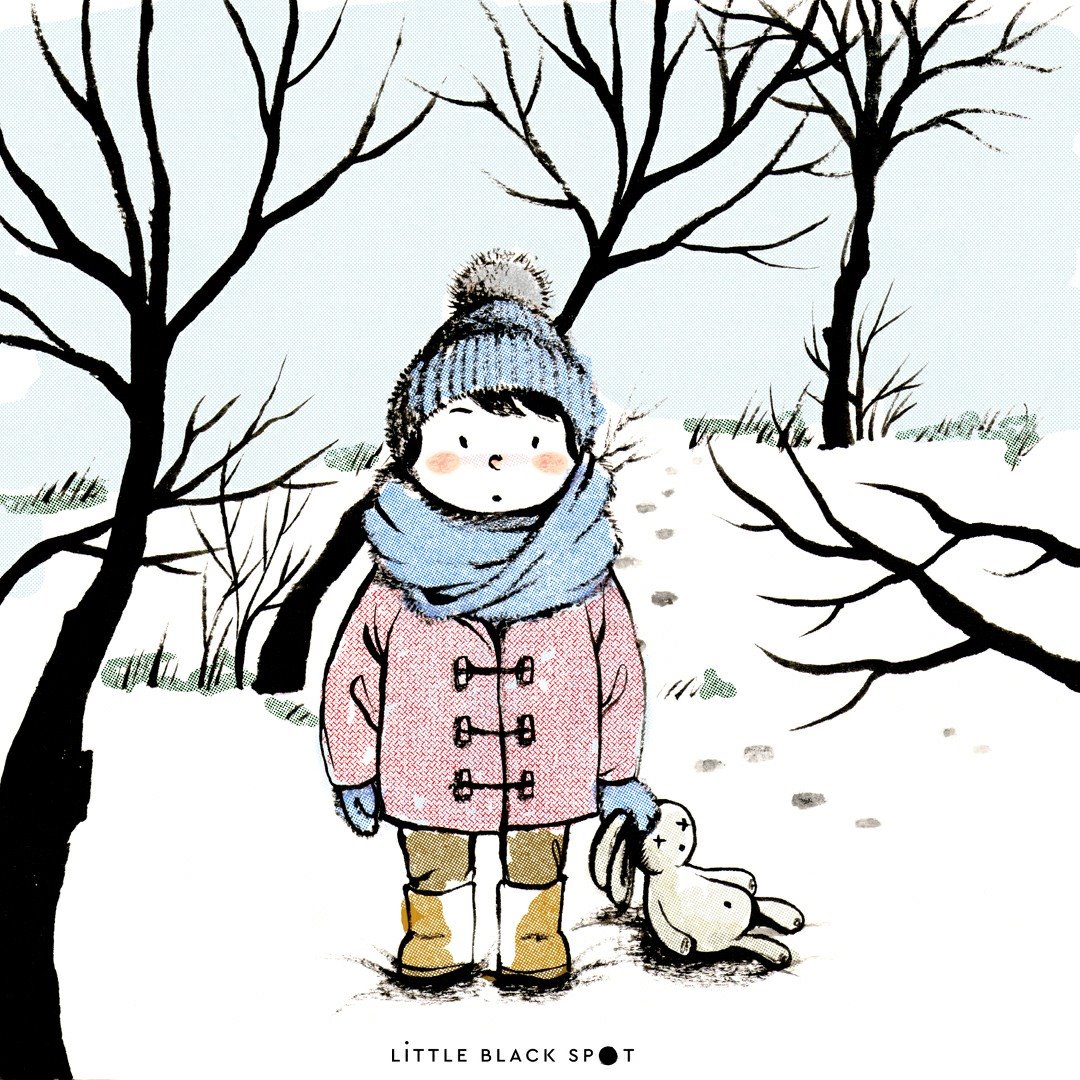 • Desenho de criança com casaco rosa, cachecol azul e gorro numa paisagem de neve com árvores sem folhas.