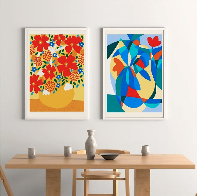• Duas pinturas emolduradas com flores coloridas sobre uma parede branca, acima de mesa de madeira com vaso e castiçais