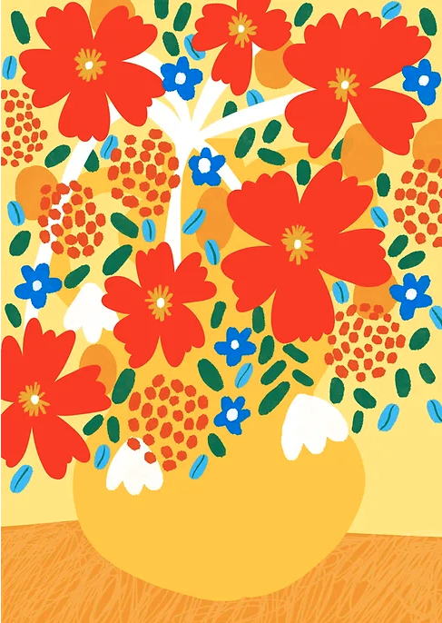 • Vaso amarelo com flores vermelhas e elementos azuis sobre superfície em madeira clara