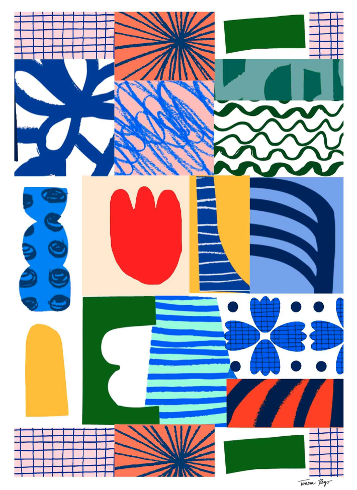Padrões abstratos coloridos em blocos com formas geométricas e assinatura Teresa Rojo