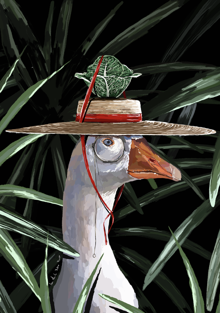• Ilustração de ganso com chapéu de palha, livro e folha, em fundo de folhas escuras