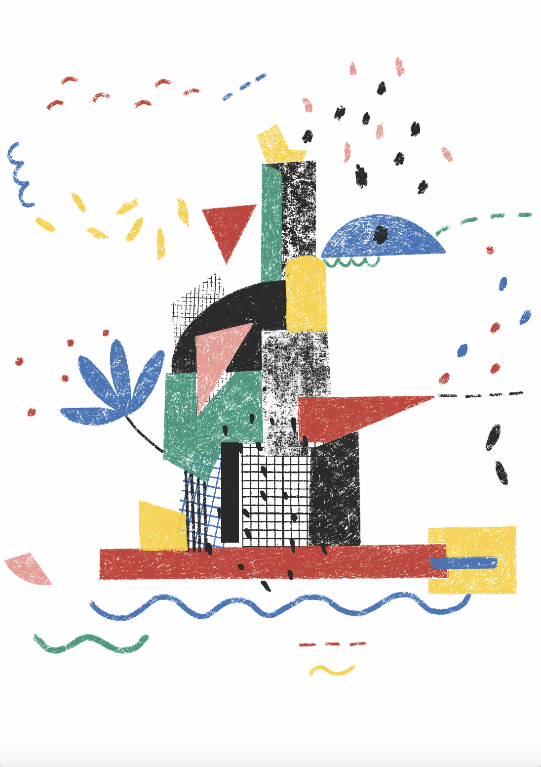 Ilustração abstrata com formas coloridas e texturizadas sobre fundo branco