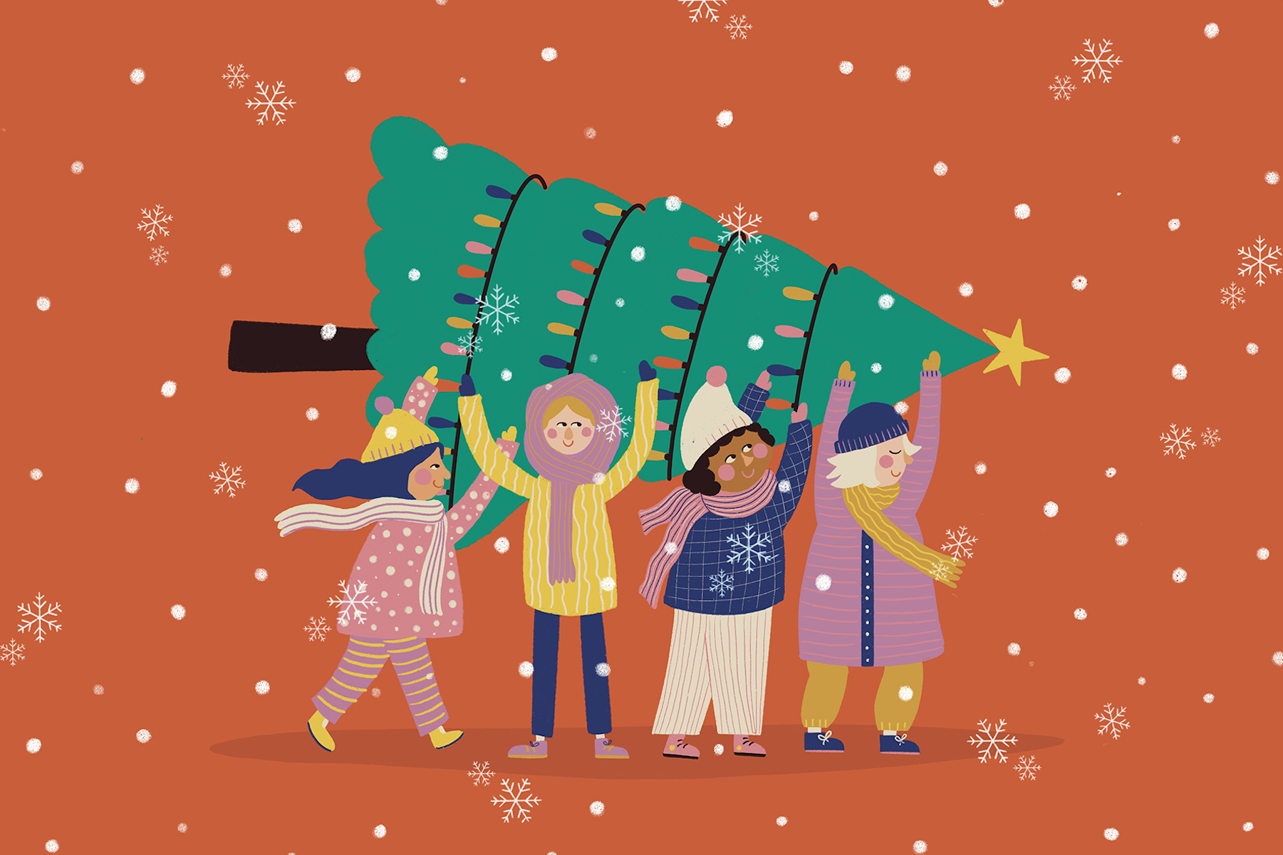 4 jovens carregando uma árvore de Natal.