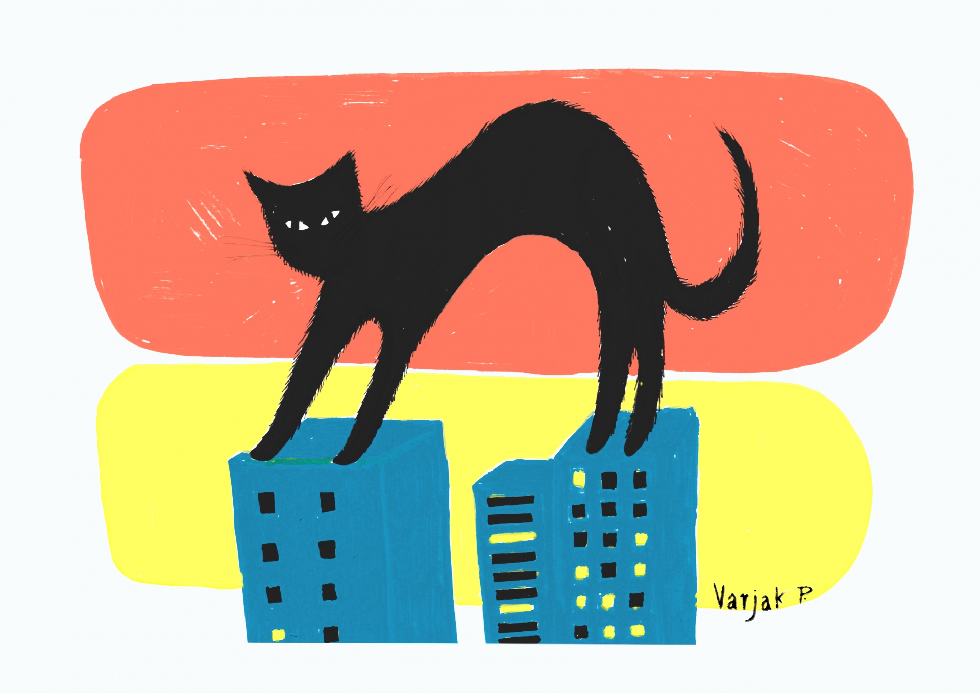 • Ilustração de gato preto arqueado sobre edifícios azuis com fundo vermelho e amarelo