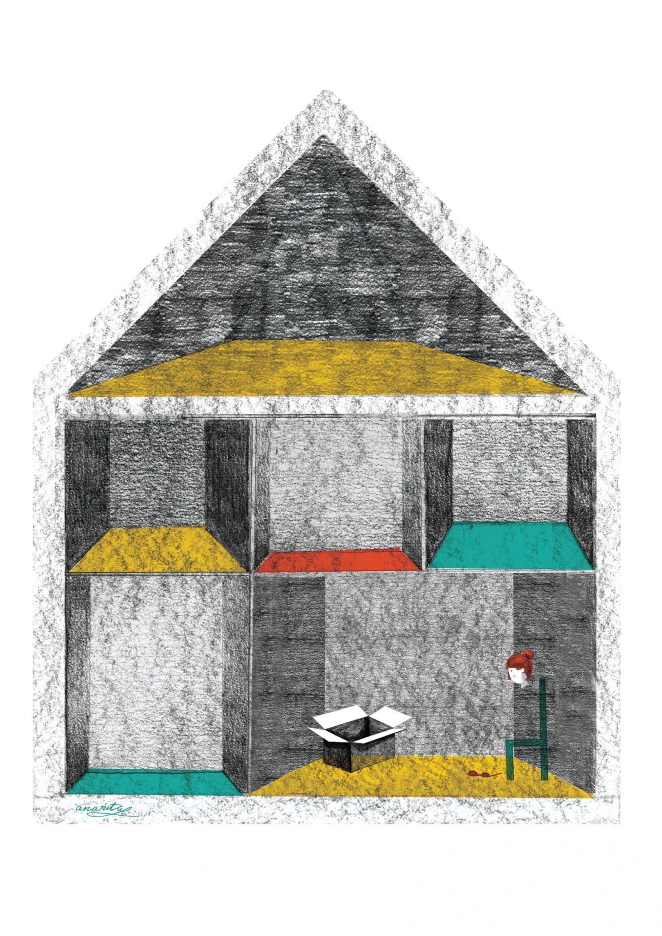Desenho de casa estilizada com blocos coloridos e figura sentada junto a uma caixa aberta