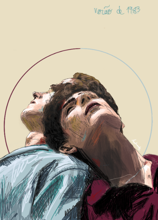 Ilustração digital de dois jovens juntos, texto 'verão de 1983' no canto