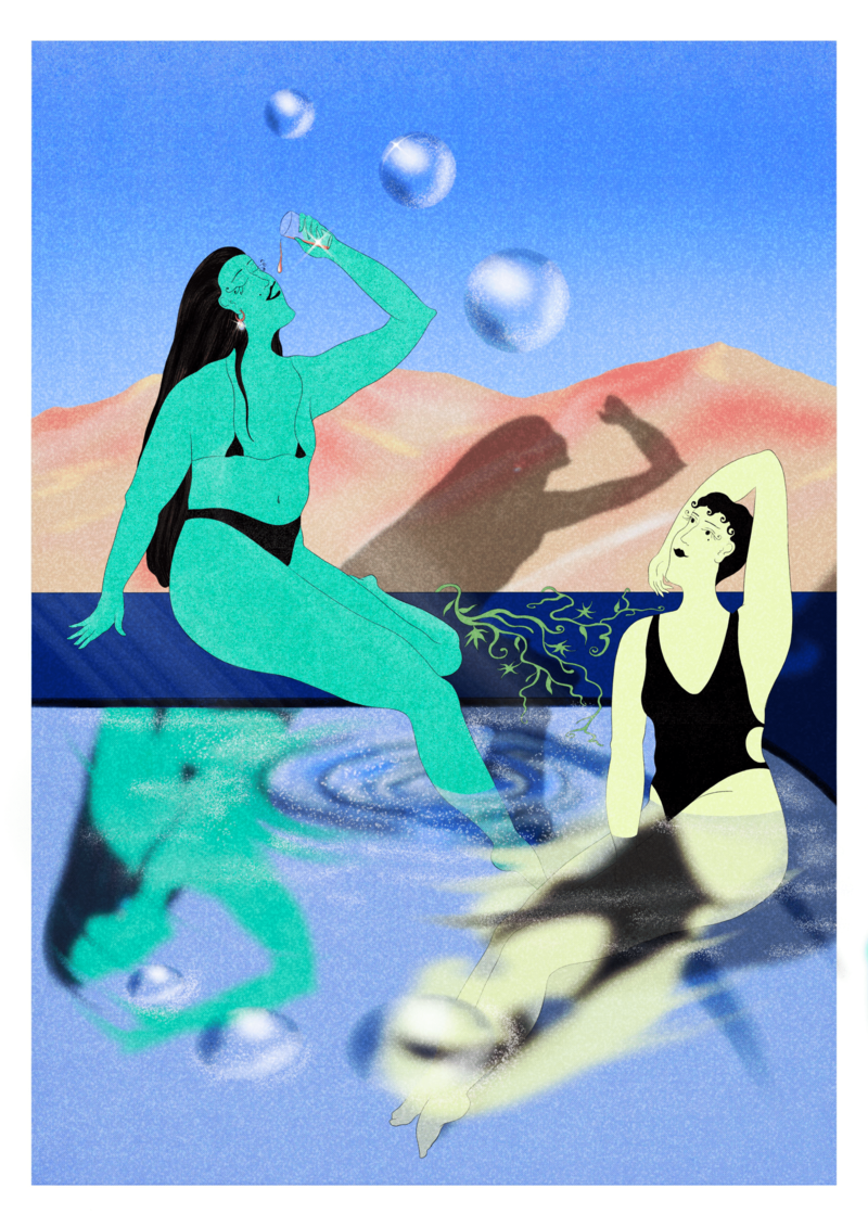 Inspirei-me nos dias mais quentes do verão, quando o calor do sol é tanto que as cores parecem desmaiar, dissolvidas pelas ondas do horizonte. Nesses dias, o toque da água torna-se mais límpido e cristalino. Na sensação de corpo quente quando toca no mar, numa piscina, numa gota de água.
